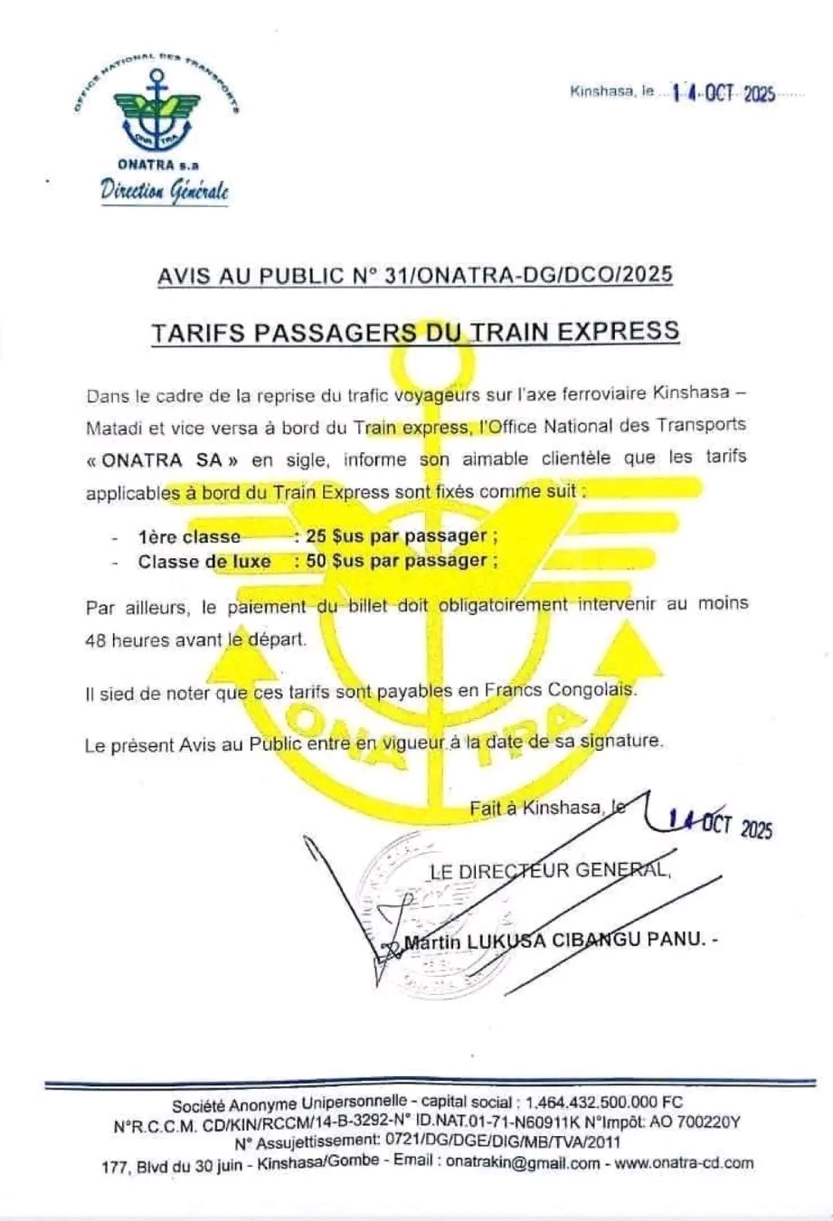 C’est un véritable vent d’espoir qui souffle sur le secteur des transports en République Démocratique du Congo. Après une interruption de plusieurs années, la compagnie nationale ONATRA (Office National des Transports) a officiellement relancé son service de train voyageurs sur l’axe historique Kinshasa–Matadi. Le premier départ est prévu ce samedi 18 octobre 2025 à 7h00 de la Gare Centrale de Kinshasa, marquant une étape cruciale pour l’amélioration de la mobilité en RDC.