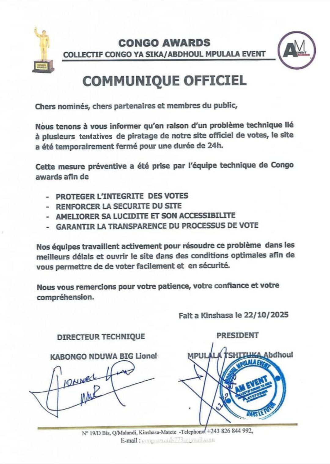 L’appel au boycott de RJ Kaniera intervient dans un climat déjà tendu pour les organisateurs. Un autre document (Communiqué Officiel du 22/10/2025) émanant du Collectif Congo Ya Sika/Abdhoul Mpulala Event, l’équipe derrière les Congo Awards, confirme que le site officiel de votes a été temporairement fermé pour une durée de 24h en raison de « plusieurs tentatives de piratage ».